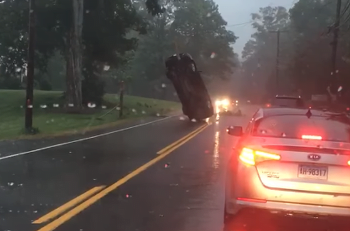 Filmado em West Suffield durante uma tempestade pesada, a imagem mostra que um carro, de alguma forma, acabou suspenso quase no meio do ar, com apenas o pára-choque traseiro tocando no chão.