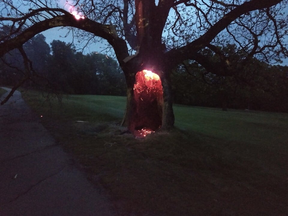 Quando os bombeiros chegaram, descobriram que o fogo havia consumido o interior da árvore, mas que haviam deixado o exterior intacto, resultando em uma silhueta latente de casca de madeira contra o céu matutino.