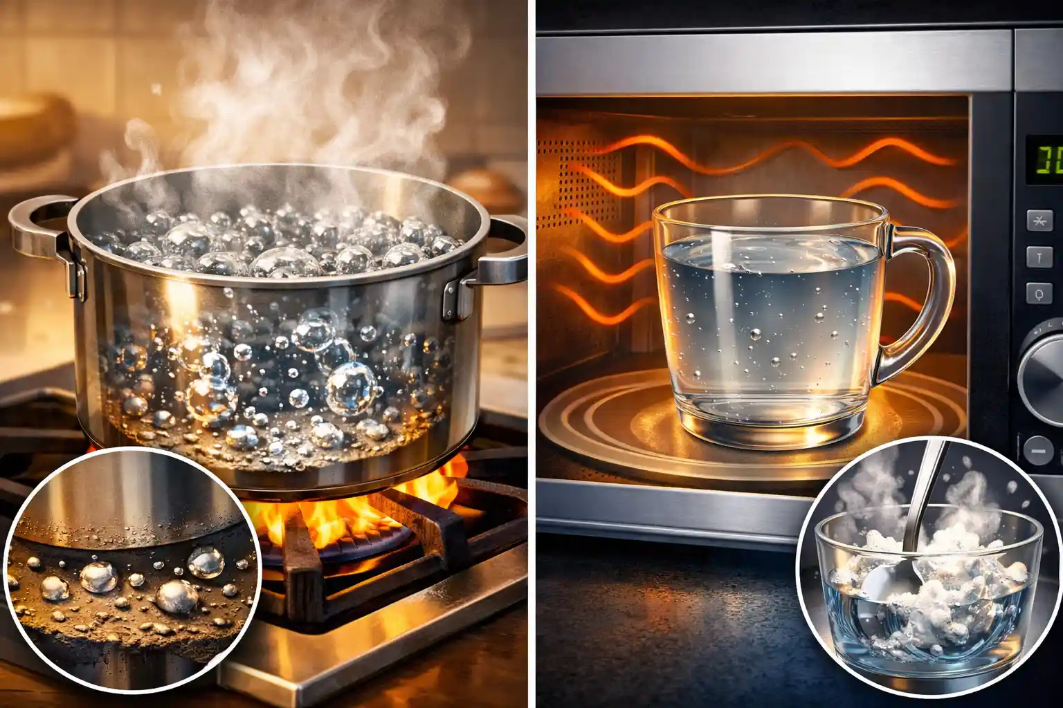 Por que a água fervente faz bolhas, menos no micro-ondas?