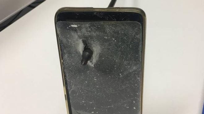 O telefone foi jogado de volta para o rosto do homem, cortando-o, mas ele estava de outra maneira ileso.