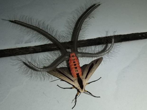 Este inseto bizarro ostenta um corpo vermelho brilhante e quatro tentáculos peludos que sobressaem de suas costas.