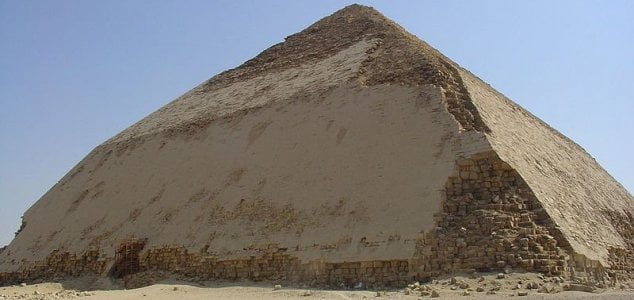 Construída para o faraó Sneferu, a pirâmide “dobrada” é particularmente incomum porque se eleva do deserto em uma inclinação de 54 graus, mas tem uma seção superior em ângulo de 43 graus.
