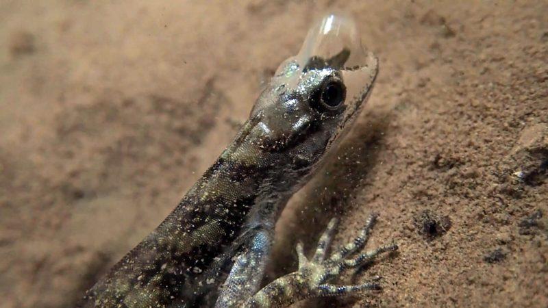 Depois de registrar os lagartos embaixo d’água, eles notaram uma bolha de ar se expandindo e se contraindo no topo de suas cabeças.