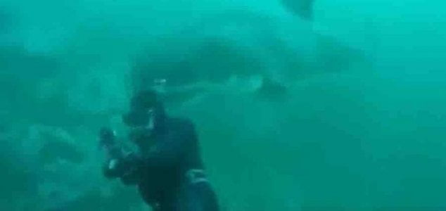 O vídeo, que foi postado na página do Facebook SA Spearfishing, mostra o momento em que o mergulhador quase acabou se tornando uma refeição fácil quando o tubarão passou a poucos centímetros de sua cabeça.