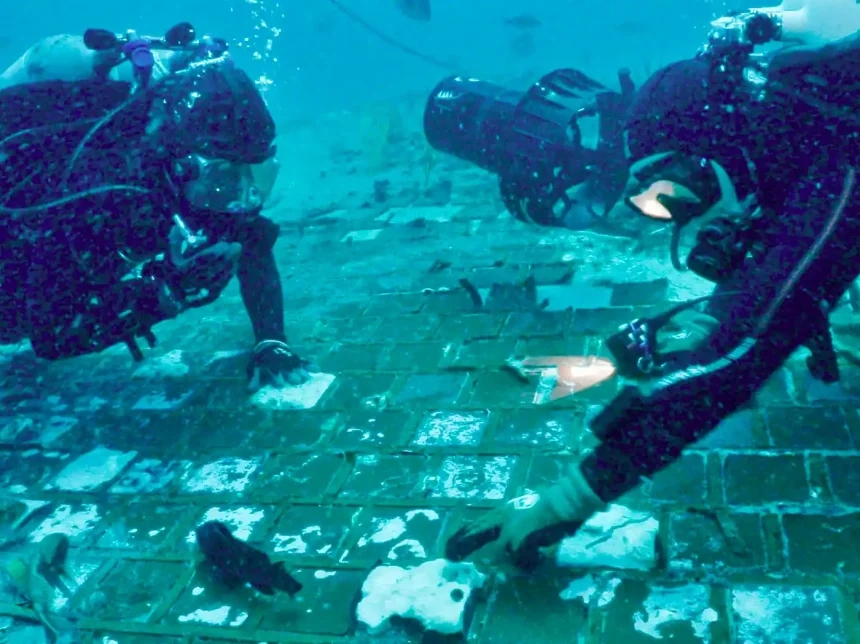 Enquanto exploravam o litoral da Flórida, os mergulhadores se depararam com estruturas artificiais cobertas por sedimentos. Entre elas, chamaram atenção placas quadradas de cerca de 20 centímetros, nas cores vermelha e branca, com marcas visíveis de desgaste.