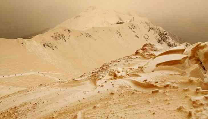 Estações de esqui em vários países ficaram parecendo a superfície de Marte após uma recente queda de neve tingida de laranja.