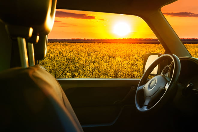 Enquanto os postes de telefone e árvores perto da estrada passam em um piscar de olhos, o sol é sempre visível durante toda a viagem. Não importa quão rápido o carro esteja, você simplesmente não pode deixar o sol para trás.