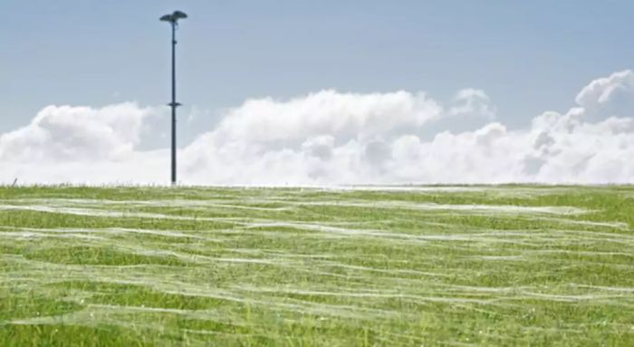 Um vídeo fascinante surgiu online e mostra um campo inteiro engolfado por uma enorme extensão de teias de aranha.