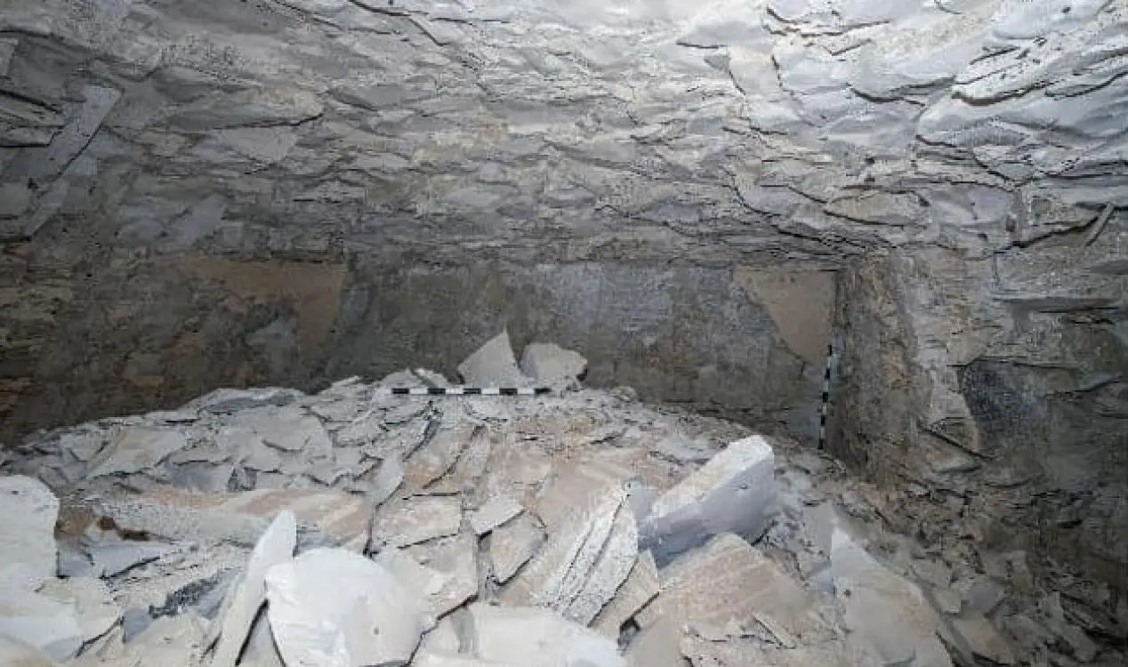 A estrutura conta com um corredor rebocado que leva à câmara funerária, com o piso elevado cerca de 1,4 metro acima do nível da câmara.