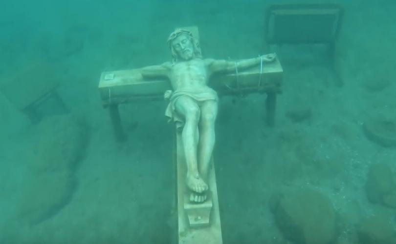 Um grande crucifixo de mármore no fundo do lago tem atraído visitantes para Petoskey há décadas.